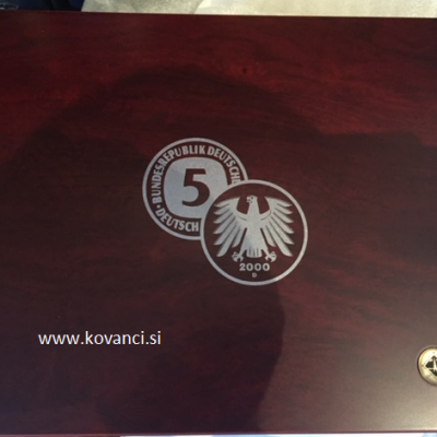 Lesena kaseta videz mahagonij , modra notranjost.Dva pladnja za 43 x 5 Nemških Mark